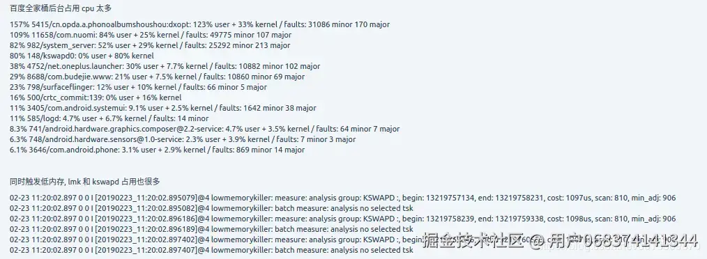 后台进程活动太多,会导致系统非常繁忙, cpu \ io \ memory 等资源都会被占用, 这时候很容易出现卡顿问题 , 这也是系统这边经常会碰到的问题。 dumpsys cpuinfo 可以查看一段时间内 cpu 的使用情况: