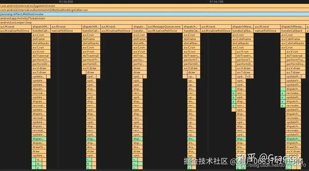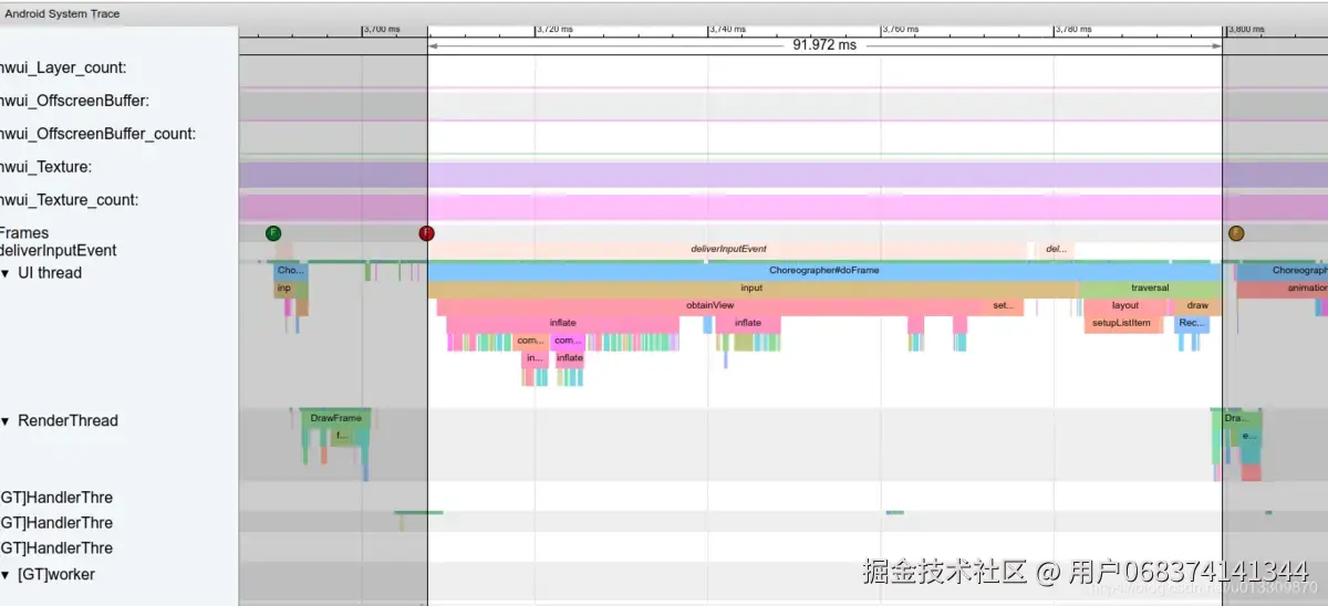 trace应用程序代码 在framework中的trace marker并没有覆盖到所有代码,因此有些时候需要自己去定义trace marker。在Android4.3之后,可以通过Trace类在代码中添加标记,这样将能够看到在指定时间内应用的线程在做哪些工作,当然,trace 的begin和end操作也会增加一些额外的开销,但都只有几微秒左右。 通过下面的例子来说明Trace类的 用法。