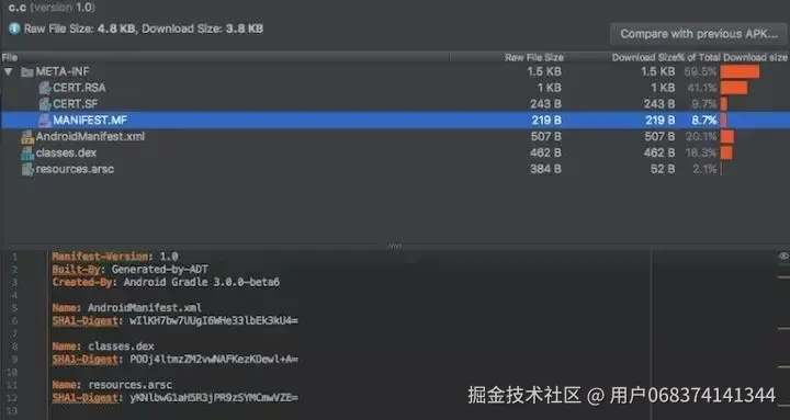很奇怪!我们对未对齐的 APK 解压缩并手工签名,并手动移除了META-INF/MANIFEST.MF,这削减了 543 字节。如果有人知道原因,请告诉我!