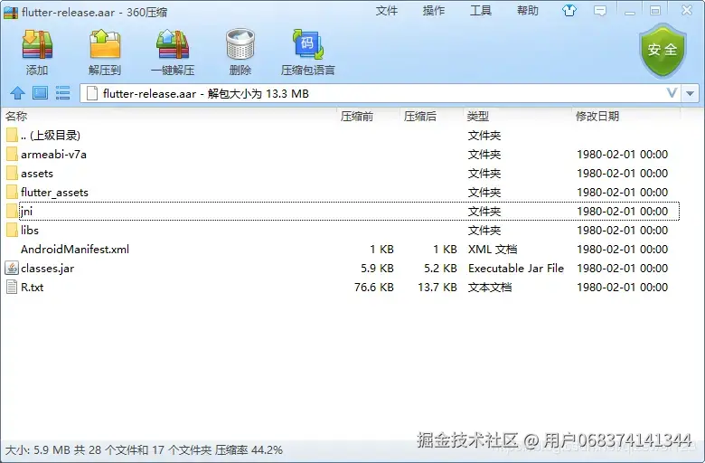 不论是创建完全的 Flutter项目,还是 Native以 Moudle的方式集成 Flutter,亦或是 Native以 aar方式集成 Flutter,最终 Flutter在 Andorid端的 App 都是以 Native项目+ Flutter 的UI产物存在的。所以在这里拆开一个 Flutter在 release模式下编译后生成 aar包来做分析: