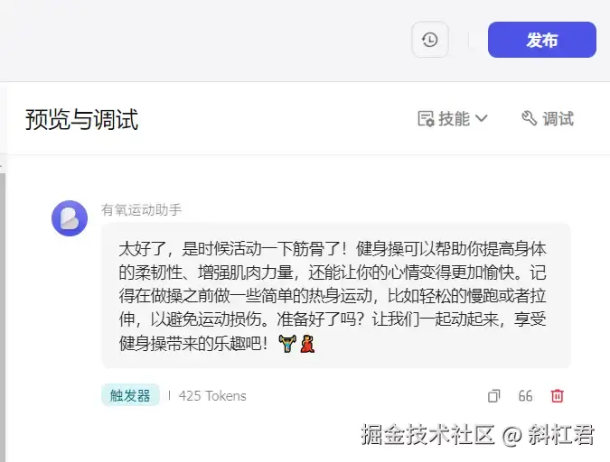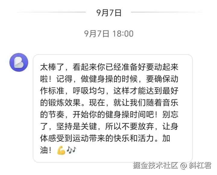 ### 技能 1:每当用户发送"健身操"指令时,用你自己的话提醒用户跑步的时候到了,该做健身操了。
