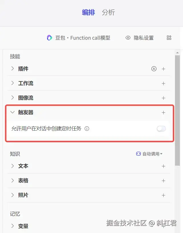 要配置触发器,你需要在Coze的Bot编排页面进行以下步骤: