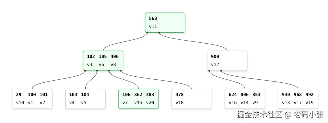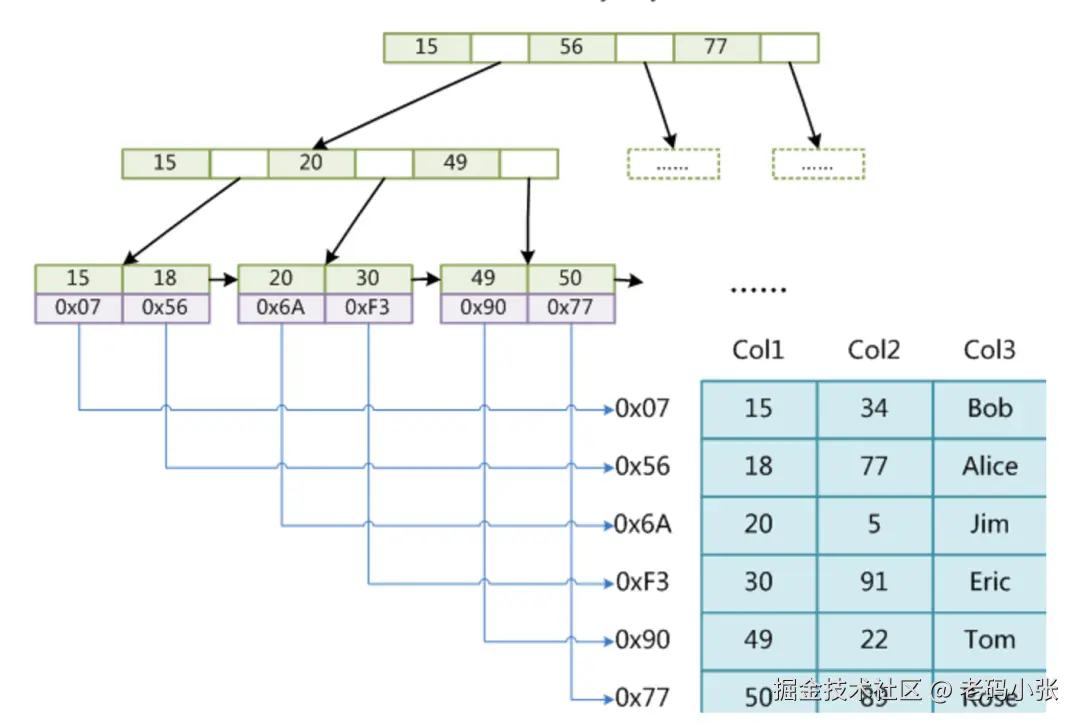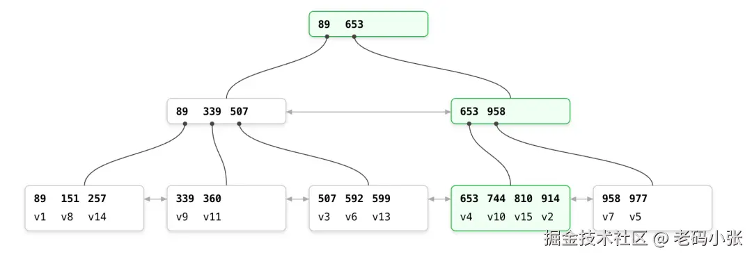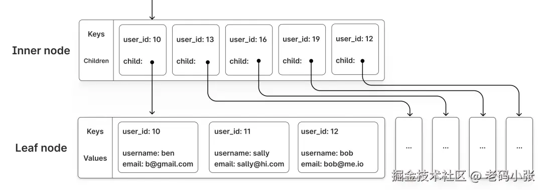 B树在数据库中的作用类似于这本“有序”的电话簿。它通过将数据分层管理,把你需要找的内容分散到不同的“节点”中。每个节点可以存多个数据项和指向子节点的指针,就像树的分支一样。而且,这棵“树”总是保持平衡,也就是说,无论你查找哪个数据,路径长度都是差不多的,不会因为有的分支特别长而导致查询慢。