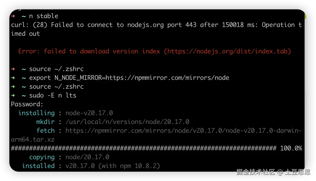 今天因为要启动sonar,需要node版本20+,使用n去下载时,发现报错超时了。curl: (28) Failed to connect to nodejs.org port 443 after 150018 ms: Operation timed out Error: failed to download version index (nodejs.org/dist/index.…