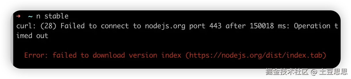 看报错信息,可以知道,是n这个命令在访问nodejs.org/dist/index.…地址时请求超时了。