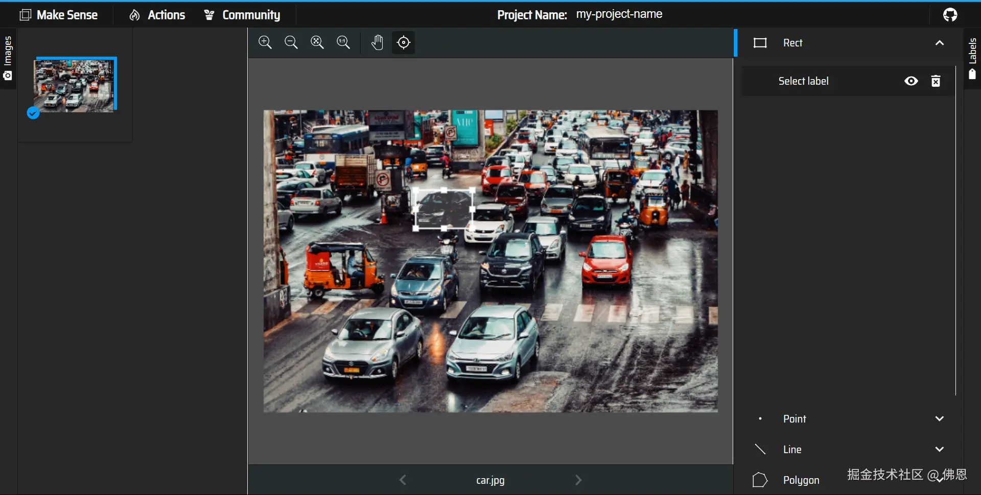 Make Sense 是一款在线标注工具,于 2019 年发布。Make Sense 显著的优势是轻量化和清晰化,相比于 LabelMe 的传统 UI 界面,使用体验显著提升看,支持常见格式的导入、导出。值得一提的是, Make Sense 受到了 YOLOv5 和 Roboflow 的官方推荐。Make Sense 基于 Typescript 开发,同时有开源版本,但代码近两年没有更新,社区问题的响应率比较低。