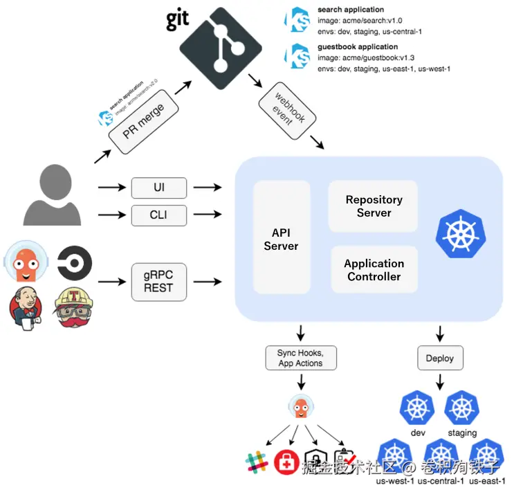 - Controller: 核心控制器,持续监控 Kubernetes 集群的当前状态与期望状态(定义在 Git 仓库中)之间的差异。Controller 负责将集群的状态与 Git 中的期望状态保持一致。
