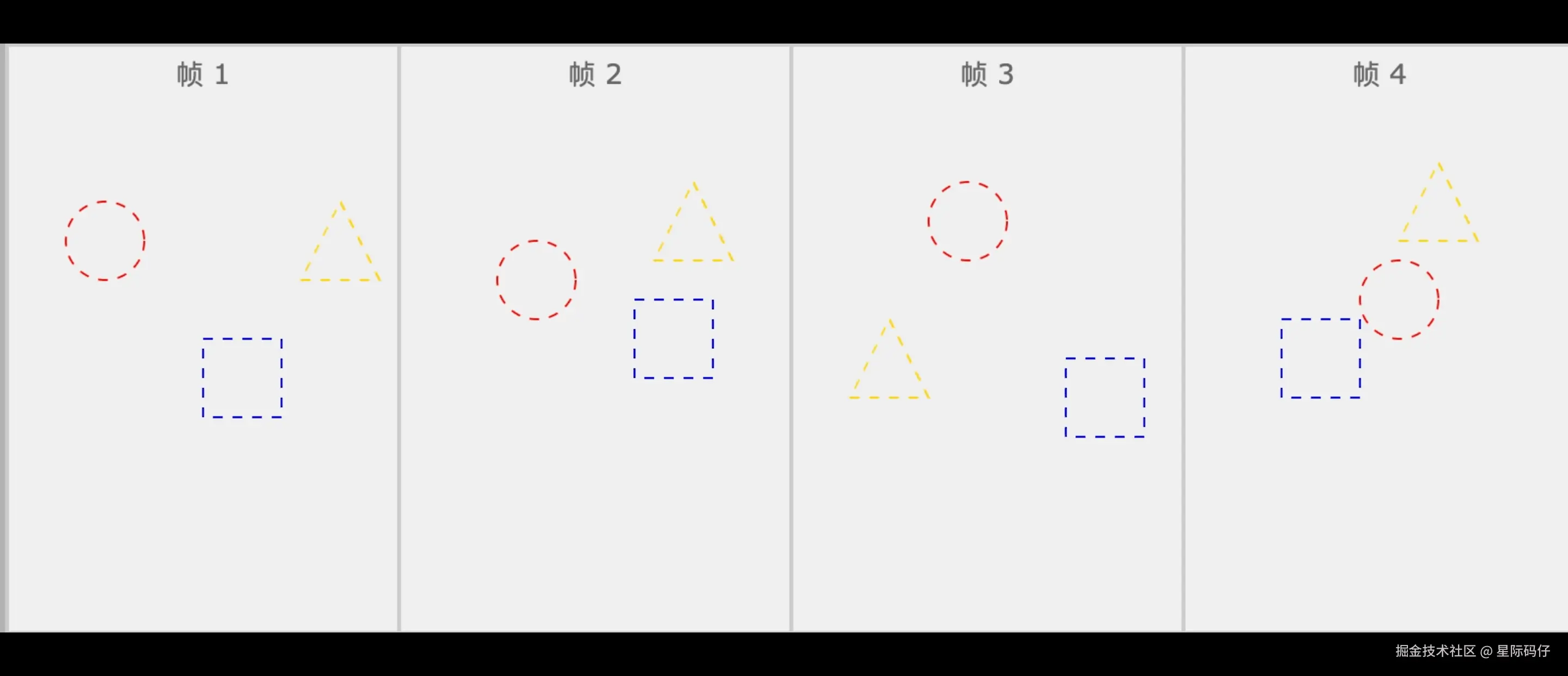 - 动画帧:代表所有元素在某一时刻的 位置、大小、旋转角度、透明度 等信息。