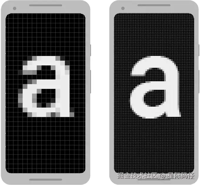 设备像素密度指的是设备屏幕单位面积内的像素数,称为dpi(dots per inch,每英寸点数)。当两个设备的尺寸相同而像素密度不同时,图像的效果呈现如下: