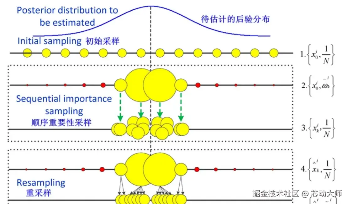 在重采样步骤中,根据粒子的权重重新选择粒子,以便更有可能保留高权重的粒子,减少低权重的粒子。这有助于确保粒子集合更好地逼近真实的后验分布。主要分为两个步骤粒子权重归一化和重采样