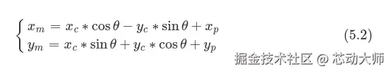 无人车实时观测到的路标结果基于自车局部坐标系,我们将其转换到地图的全局坐标系,关于坐标系变换推导并不复杂,可见参考 34。假设当前时刻自车观测到某个路标 lmrk(xc,yc)lmrk(xc,yc),下角标 cc 表示自车坐标系,该路标对应于地图坐标系中的位置为 lmrk(xm,ym)lmrk(xm,ym),下角标 mm 表示地图坐标系。对于粒子 p(xp,yp,θp)p(xp,yp,θp),下角标 pp 表示粒子,我们直接给出从 lmrk(xc,yc)lmrk(xc,yc) 到 lmrk(xm,ym)lmrk(xm,ym) 的坐标变换方程。