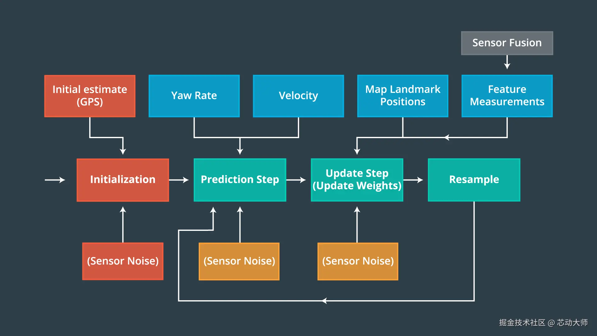 这里面其实涉及到几个步骤,其实主要起到的作用是更新+粒子权重更新的部分。