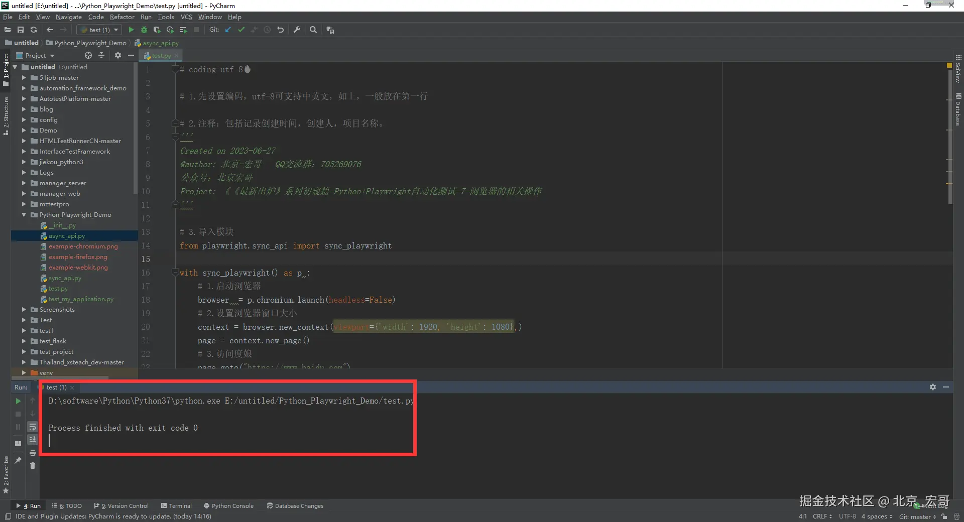实战举例:以度娘为例,首先启动浏览器,然后再设置浏览器的大小。查询“北京宏哥”后,刷新页面执行回退到百度首页,然后有执行前进进入到搜索“北京宏哥”页面,最后退出浏览器。