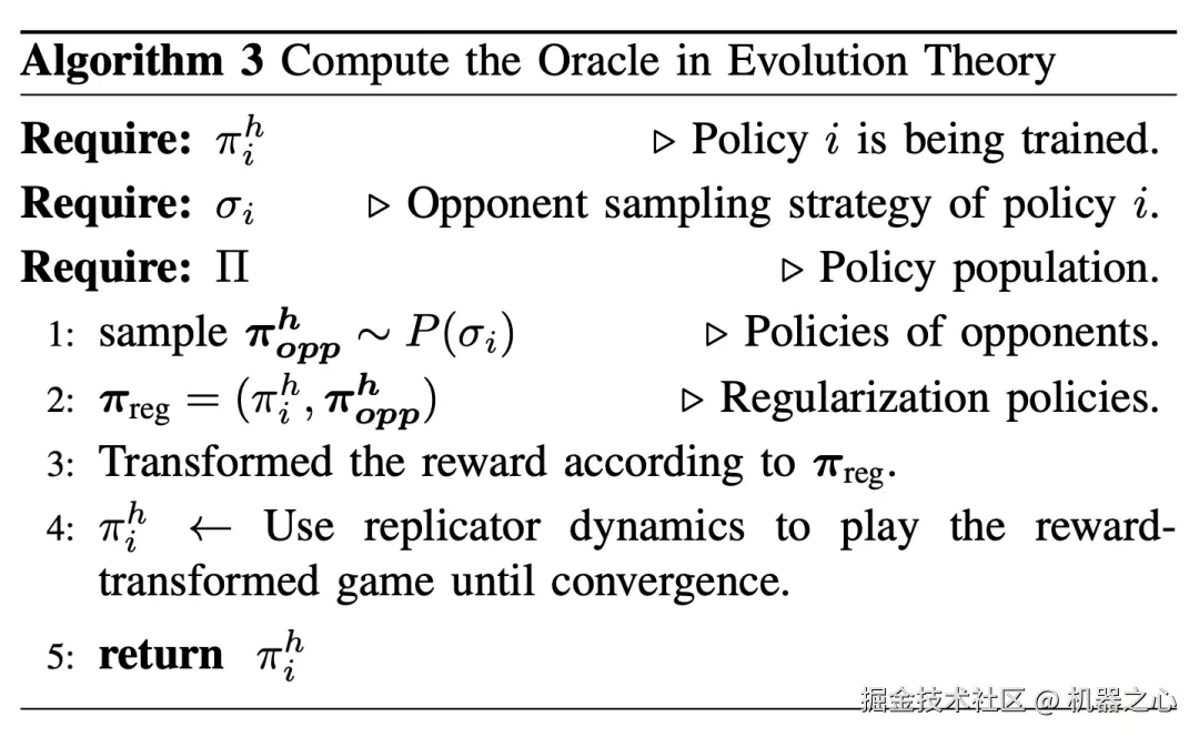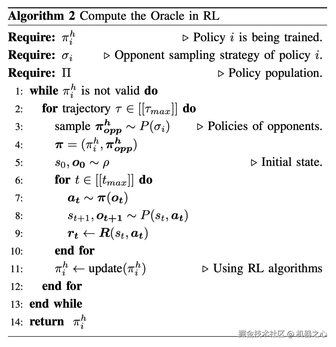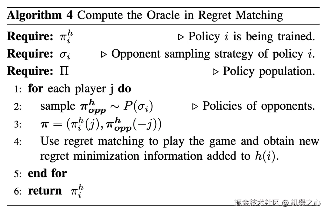 ● 算法 1 伪代码第 4 行:可以选用不同的 ORACLE 算法得到训练策略,最直接的方式是计算 BR 。但是由于对于复杂任务来说,直接计算 BR 难度高,因此通常选择训练近似 BR 来训练策略,可以采用强化学习(算法 2),进化算法(算法 3),后悔最小化(算法 4)等方法。