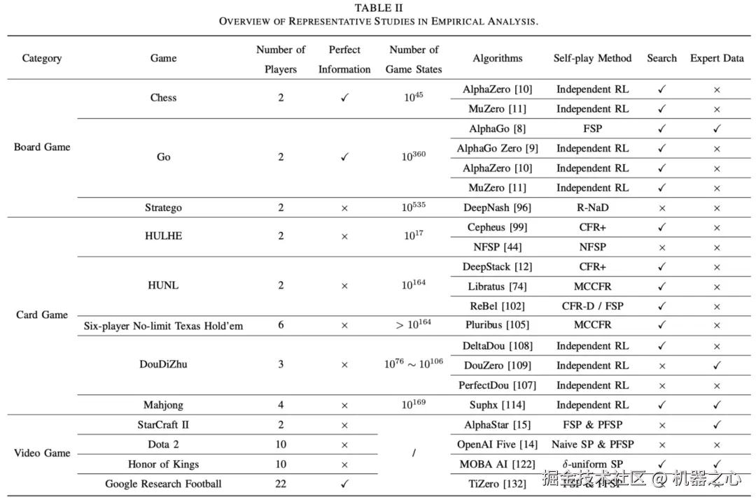 棋类游戏领域,绝大多数是完全信息游戏,曾因引入两项关键技术而发生革命性变化:位置评估和蒙特卡罗树搜索。这两项技术在象棋、西洋跳棋、黑白棋、西洋双陆棋等棋盘游戏方面展现了超越人类的效果。相比之下,当这些技术应用于围棋时,由于围棋棋盘布局种类远超于上述提到的棋类游戏,因此仅能达到业余水平的表现。直到 DeepMind 推出了 AlphaGo 系列而发生了革命性的变化,AlphaGo 系列算法利用自博弈的强大功能显著提升了性能,为围棋领域设立了新的基准。