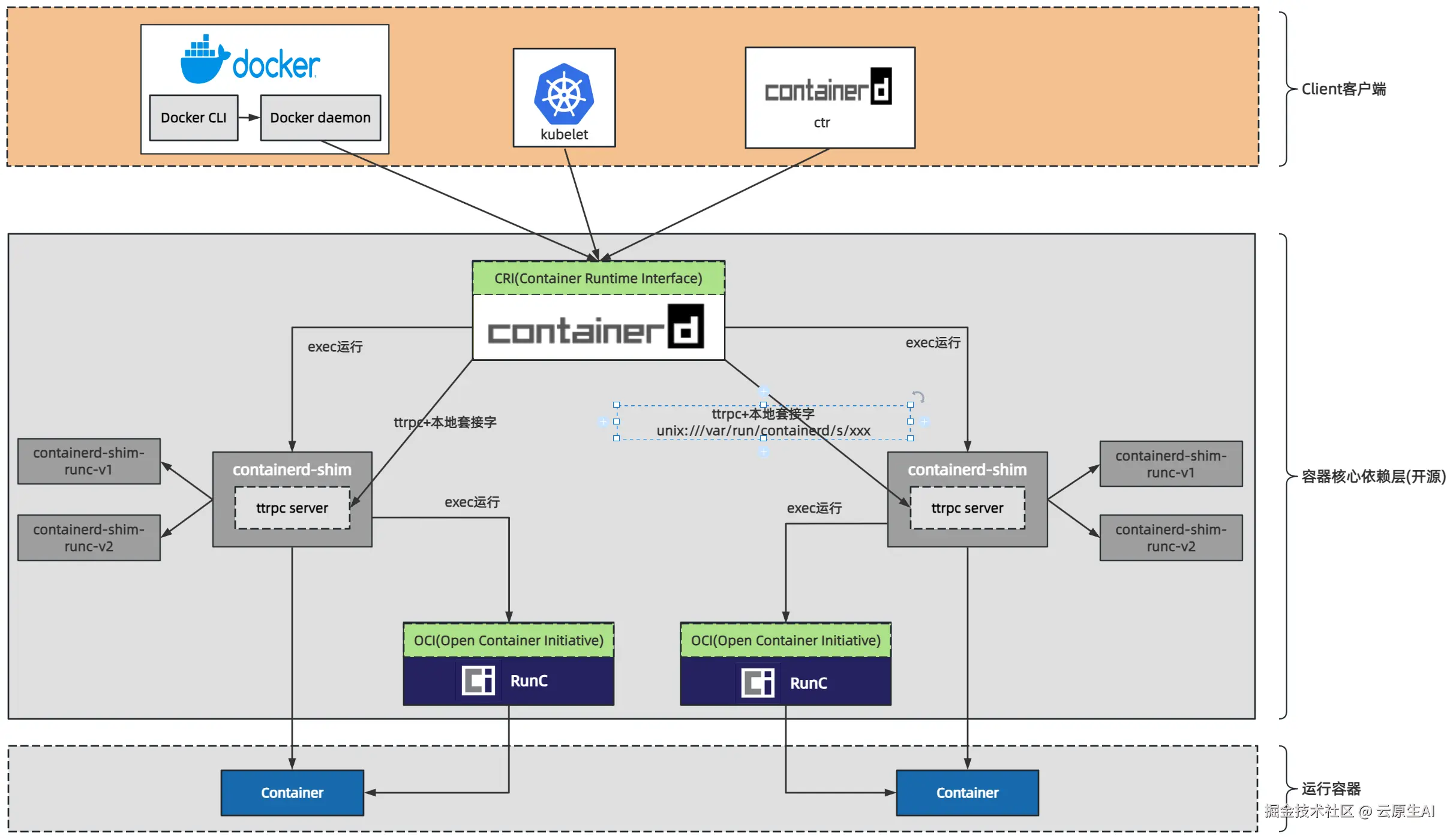 Client: 对于docker、kubelet还是ctr(Containerd CLI)来说,它们都是Containerd容器运行时客户端,通过gRPC协议和Containerd进程交互。