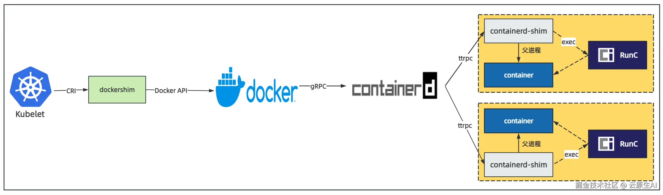 - Kubelet 通过 CRI 接口(gRPC) 调用 dockershim, 请求创建一个容器,目前 dockershim 的代码其实是内嵌在 Kubelet 中的。