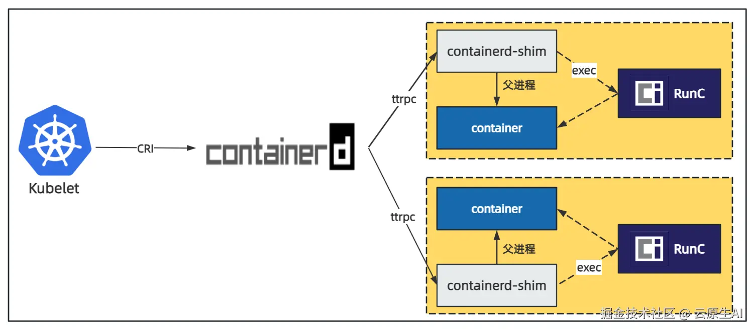 runc这个命令行工具, 来创建容器、启动容器。 runc启动完容器后本身会直接退出, containerd-shim 则会成为容器进程的父进程, 负责收集容器进程的状态, 上报给 containerd, 并在容器中 pid 为 1 的进程退出后接管容器中的子进程进行清理, 确保不会出现僵尸进程。