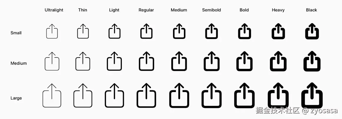 SF 符号有各种重量和比例。这使您可以创建易于调整的设计。一些粗细选项包括细、细、粗、重等。下图显示了可用的粗细。