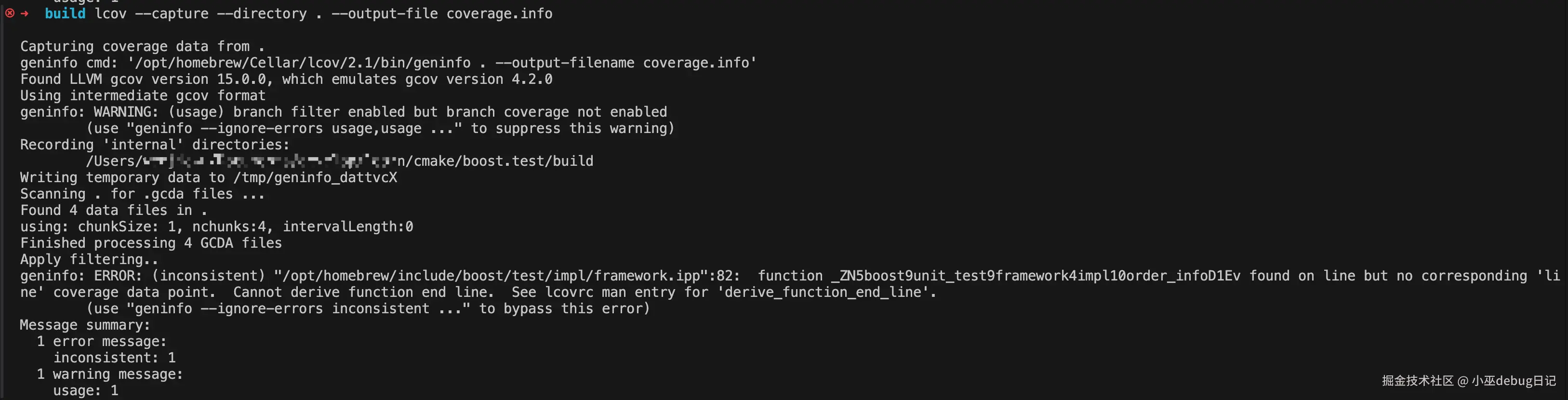 笔者的开发环境主要是Mac+VSCode,但Lcov对Mac系统并不太友好,前面的demo工程虽然编译通过了,但生成代码覆盖率报告就报错,猜测Mac的符号表机制跟Linux不太一样,最后还是在私有构建机的Linux环境跑通了。