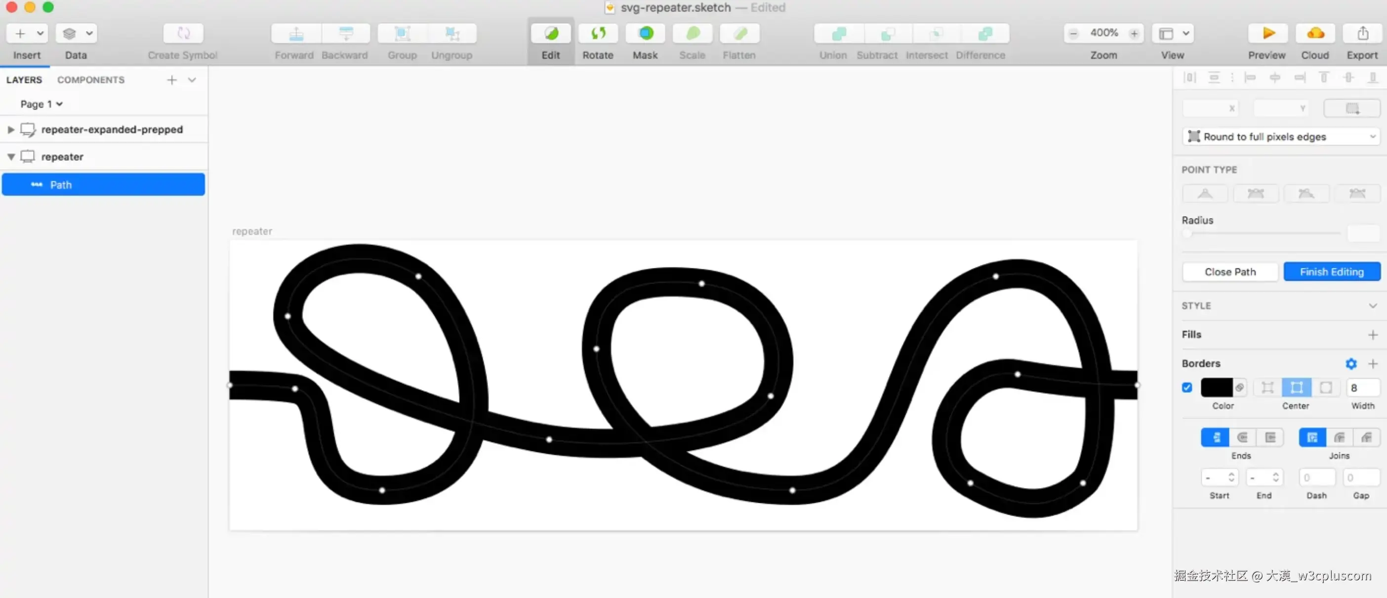 首先,使用一个矢量制图软件,比如Sketch软件,快速画一条线(其实就是<path>)。怎么画,前面有提到过,这里有一点需要注意的是,为了让线条能重复,需要确保线条在水平方向可以无缝衔接。要做到这一点,只需要确保第一个点和最后一个点的 y 坐标值相同。