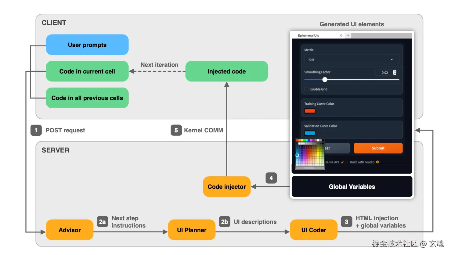 - 客户端-服务器通信:用户在JupyterLab中的操作通过HTTP POST请求发送到服务器,服务器上的LLM代理处理这些请求并生成响应的UI元素或代码。