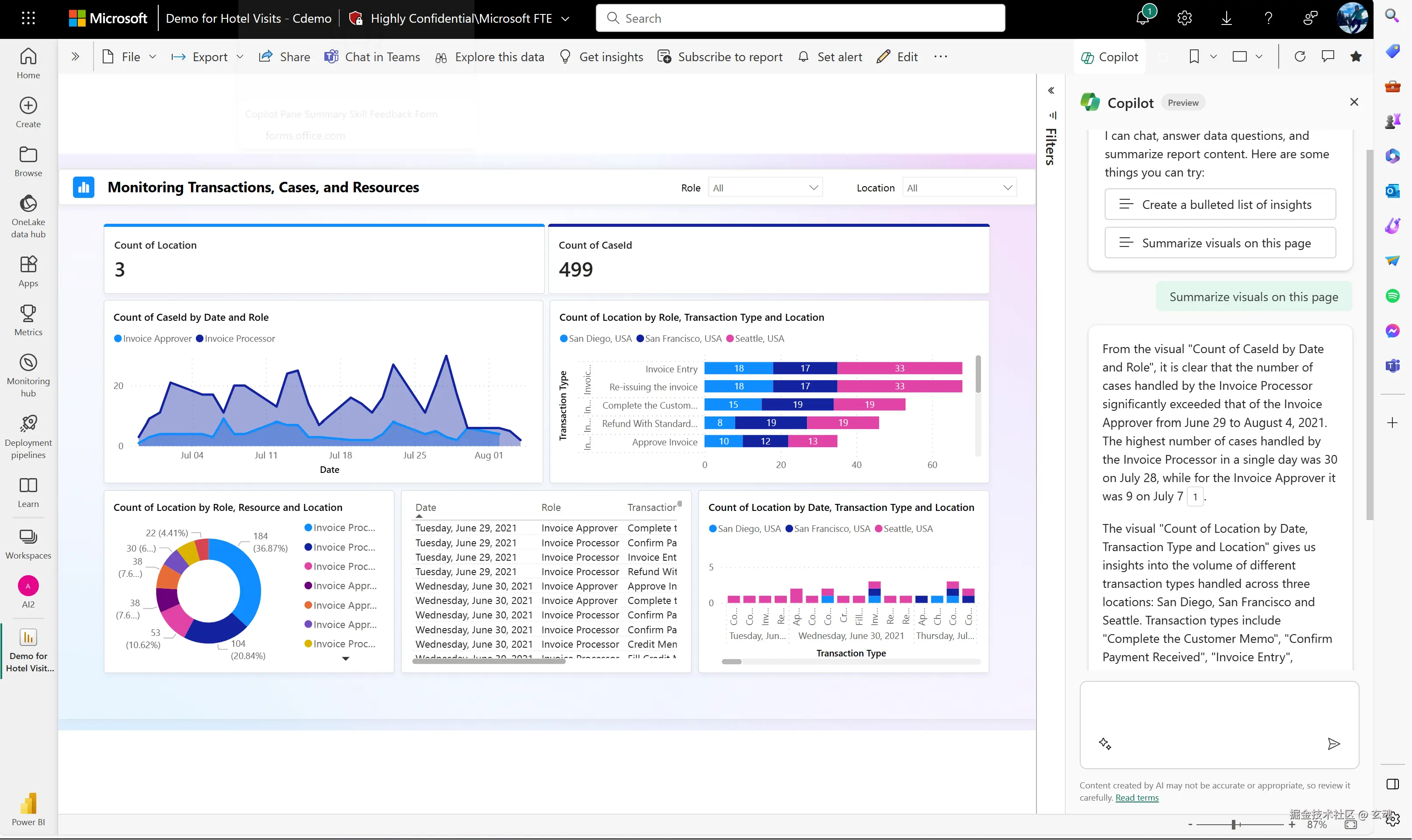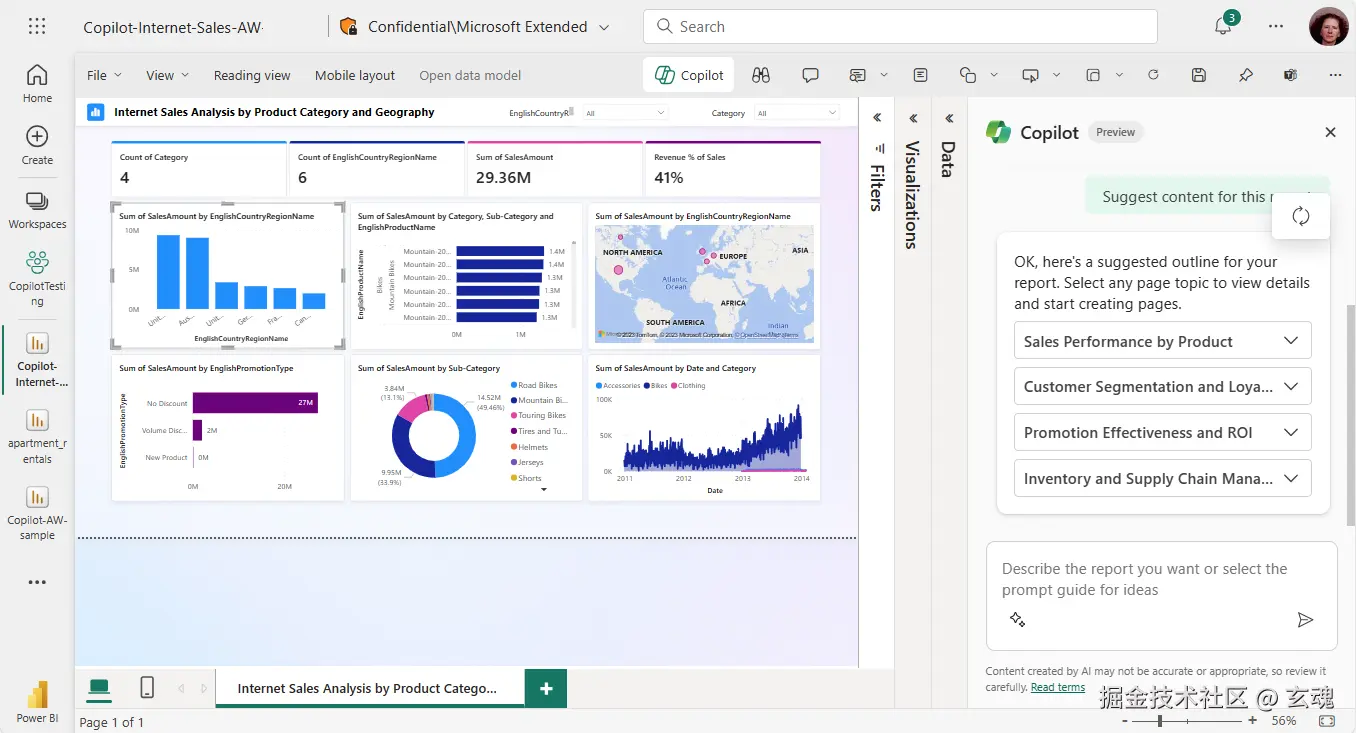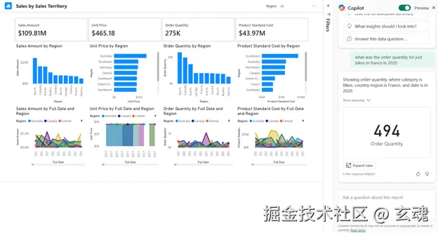 Copilot 还可以使用语义模型中的度量值和列来探索数据。询问有关报告和数据集的问题时,Copilot 会检查是否可以在报告视觉效果中找到答案。如果现有视觉效果无法回答问题,Copilot 会直接构建视觉效果。