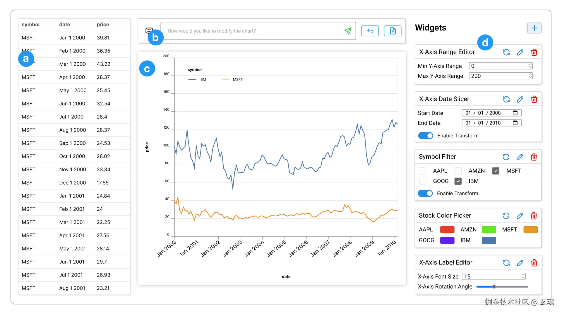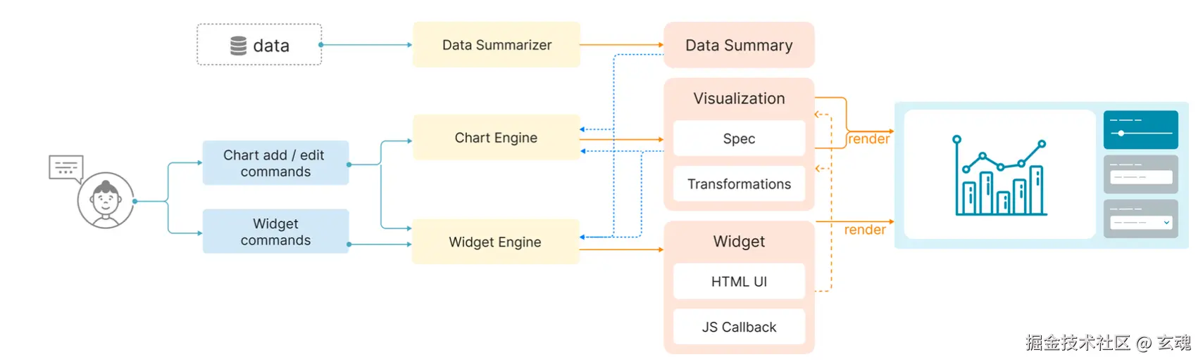 - 可视化预处理:在发送编辑或小部件合成请求到大型语言模型(LLM)之前,系统会从可视化规范中分离数据,并去除不必要的图表属性,以防止上下文溢出,并确保渲染引擎对UI变化的响应性。