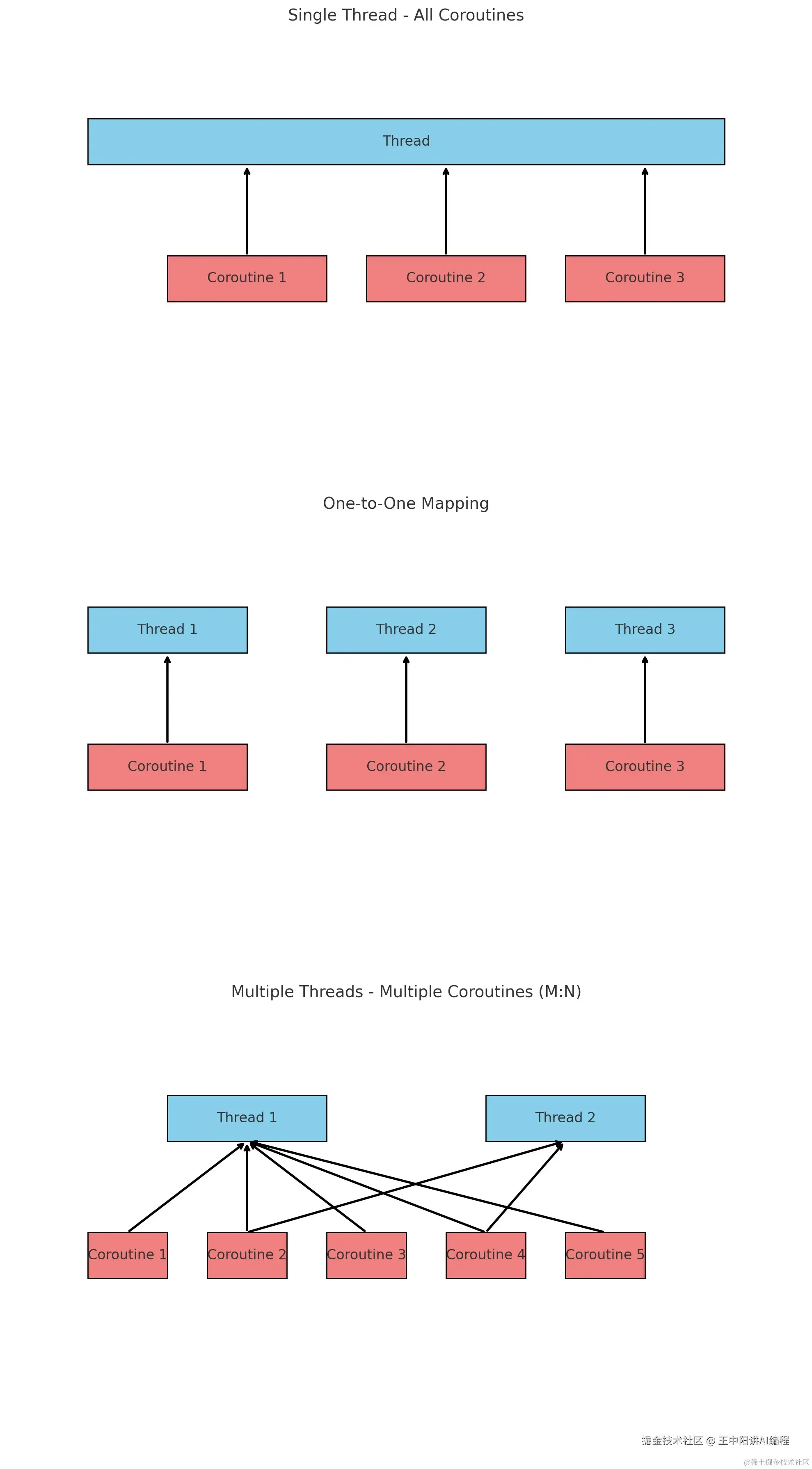 - 用户态线程:由用户程序管理,需绑定到内核态线程上执行,协程即为用户态线程的一种。