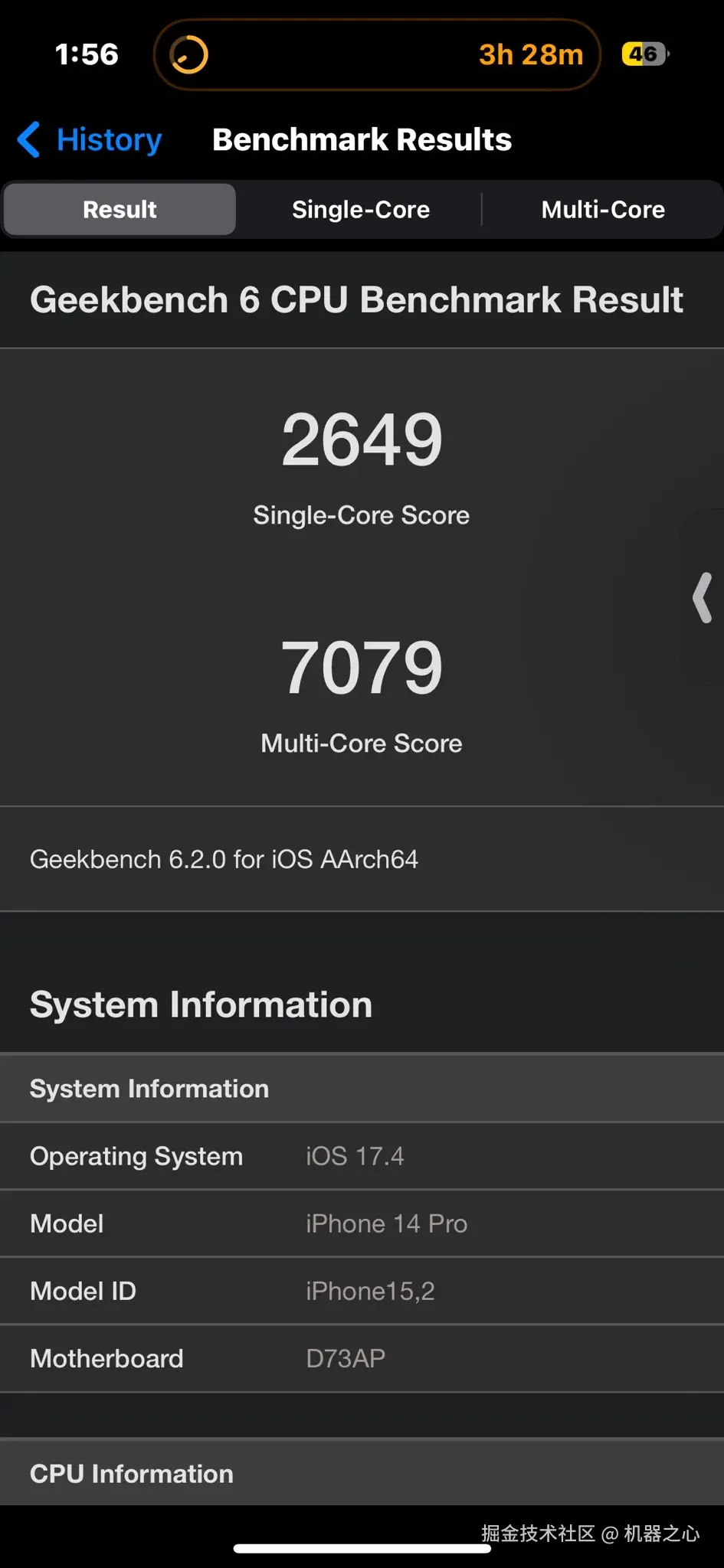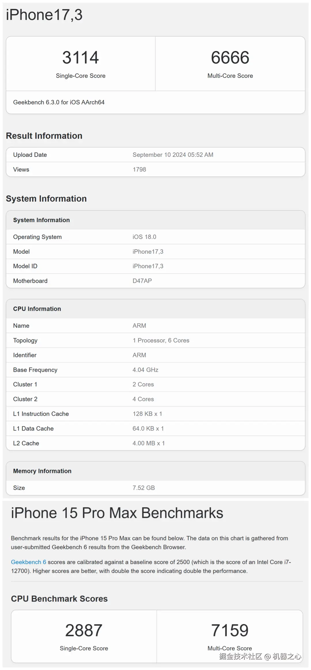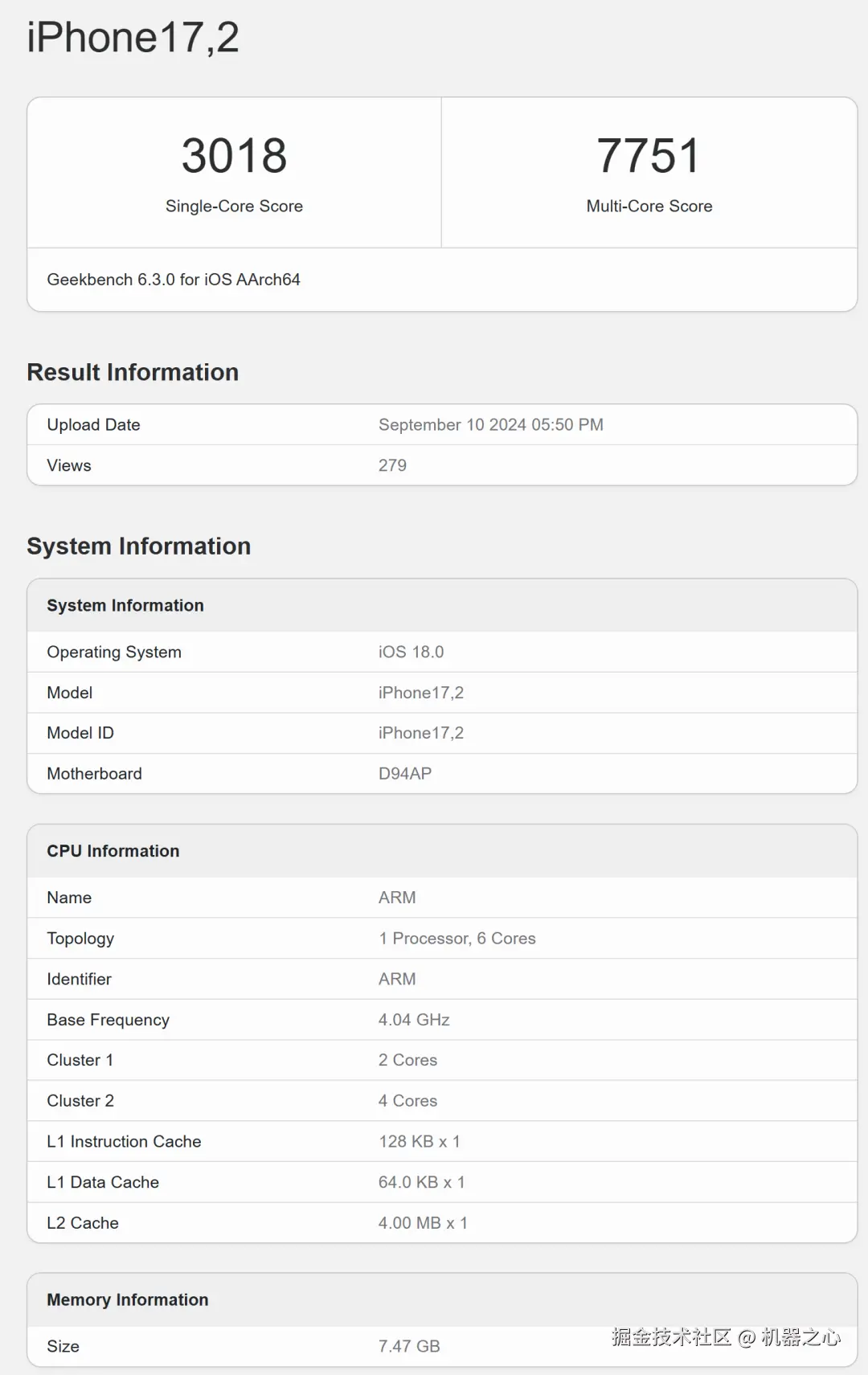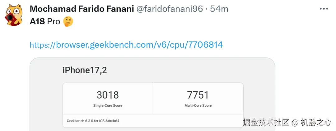此外,Geekbench 6 上还出现了另一款机型为「iPhone17,2」的跑分成绩,单核为 3018 分、多核为 7751 分。