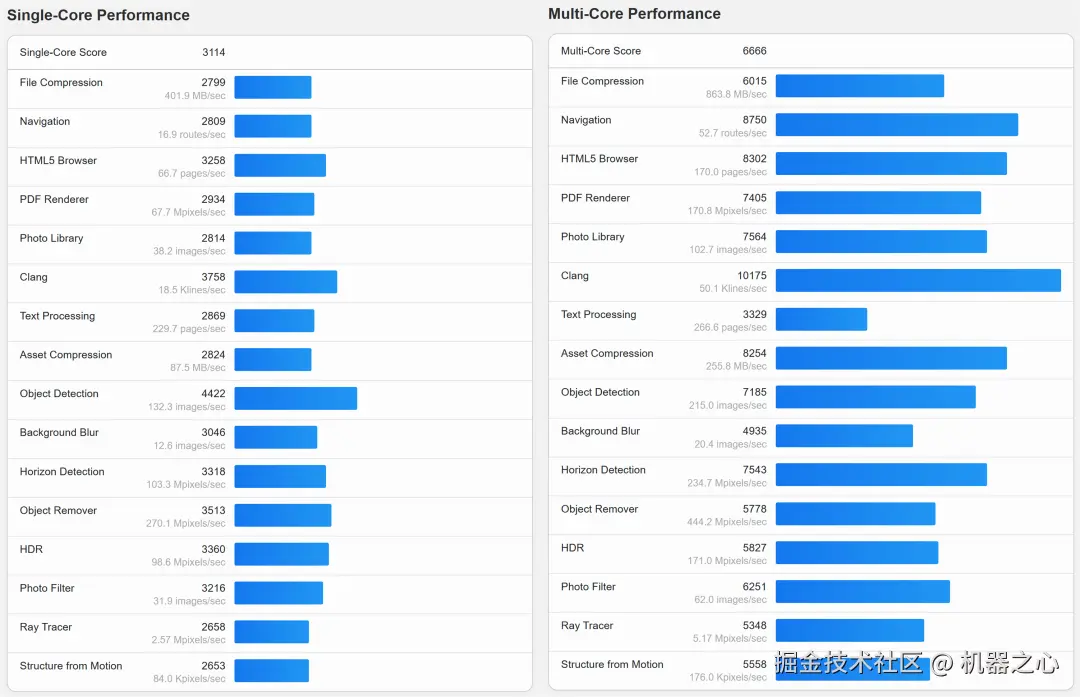 单核 / 多核成绩中各自列出了文件压缩、导航、HTML5 浏览器、PDF 渲染器、图库、文本处理、对象删除、HDR、照片过滤、光追等具体任务的跑分。