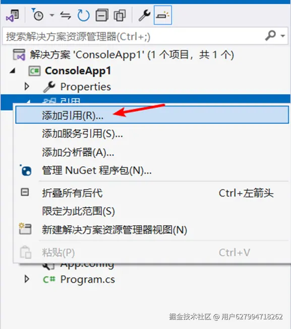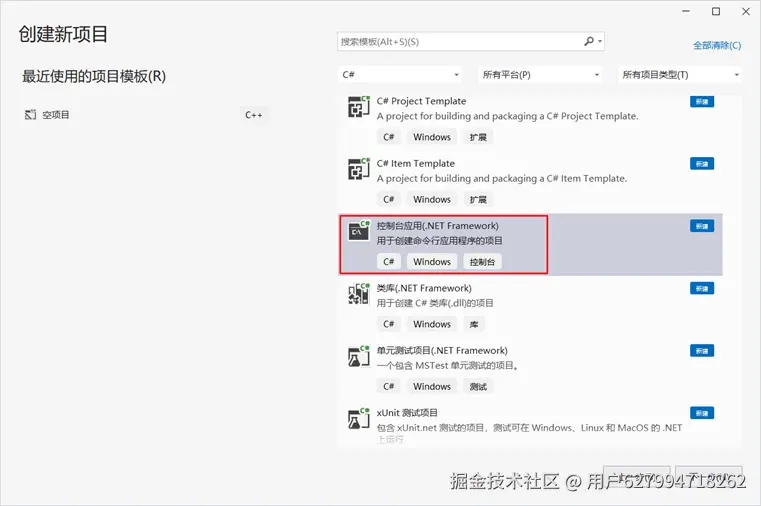 打开Visual Studio 2022,创建新项目,选择控制台应用(.NET Framework),点击下一步。