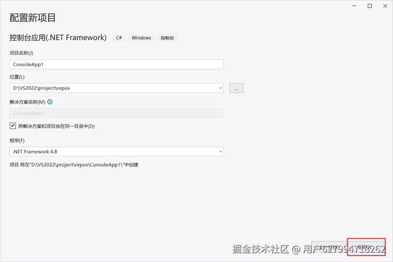 使用.NET Framework 4.8,创建控制台应用程序,指定项目名称为 ConsoleApp1,位置等。