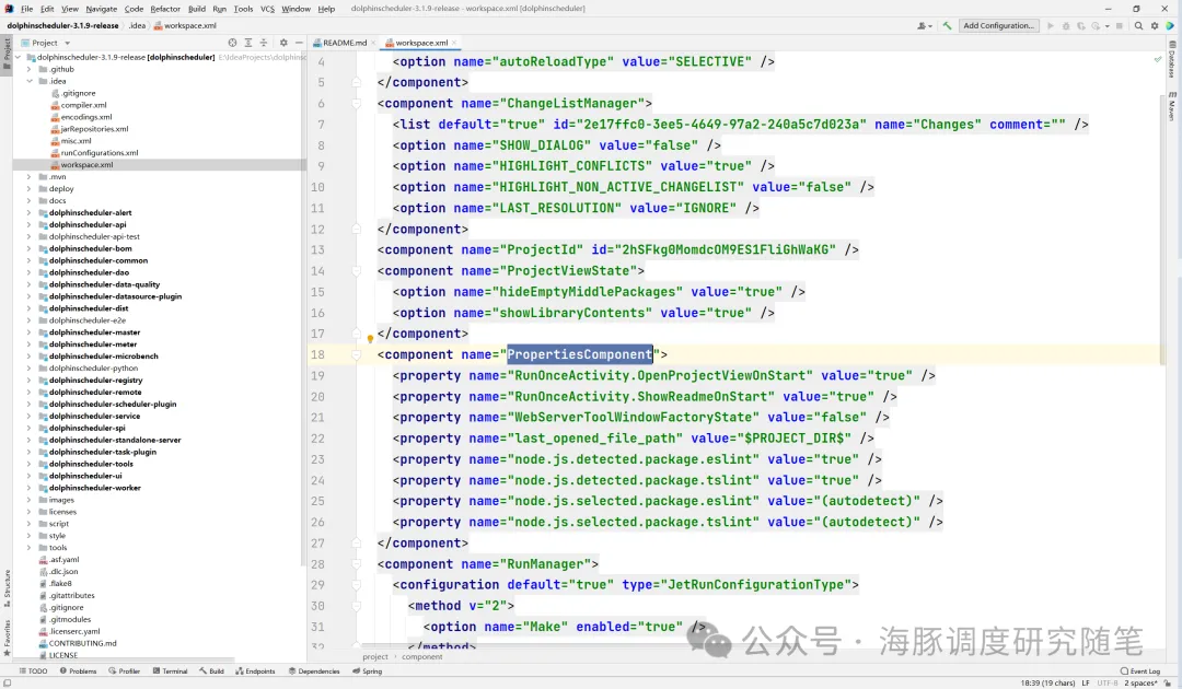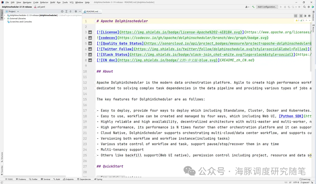 首先,前往 DolphinScheduler官网 下载 dolphinscheduler-3.1.9-release.zip 源码压缩包,并将其移动到你的IDEA工作目录中。接着,使用IDEA工具解压并打开该项目。你将看到如下界面: