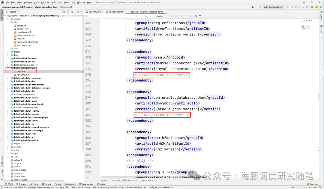 打开dolphinscheduler-bom模块的pom文件,将MySQL和Oracle的依赖中的<scope>test</scope>注释掉,右上角的Maven要记得点击进行更新。