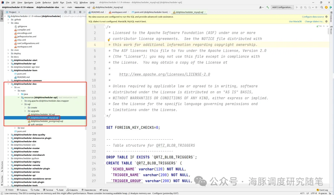 在MySQL中创建 dolphinscheduler 数据库,并执行提供的SQL脚本进行数据库初始化。