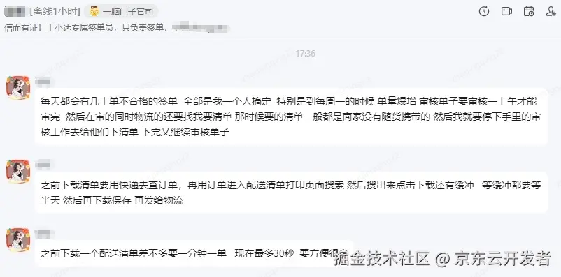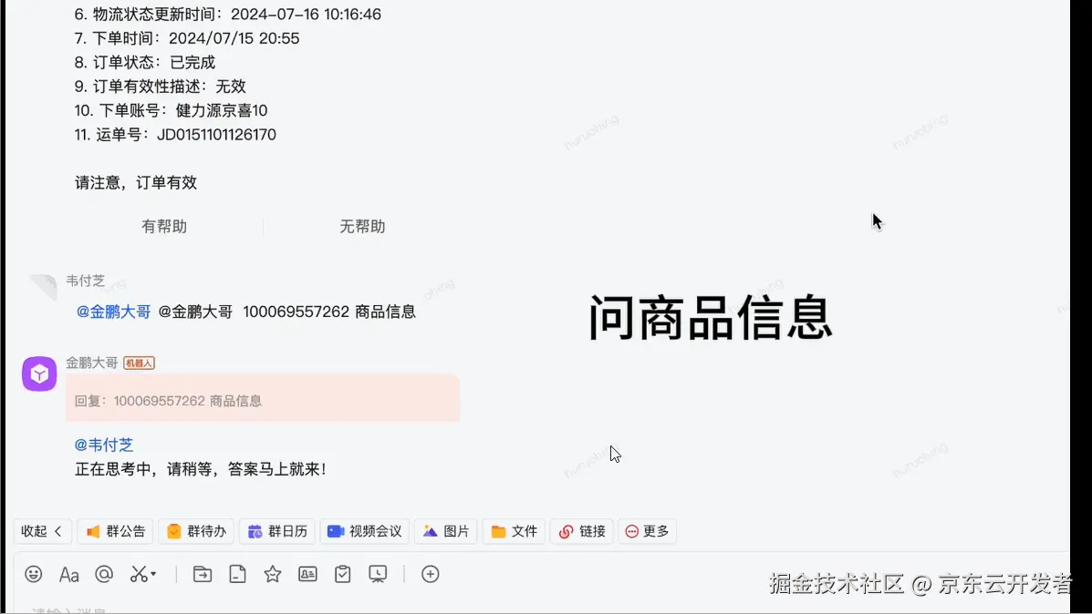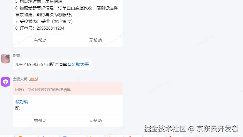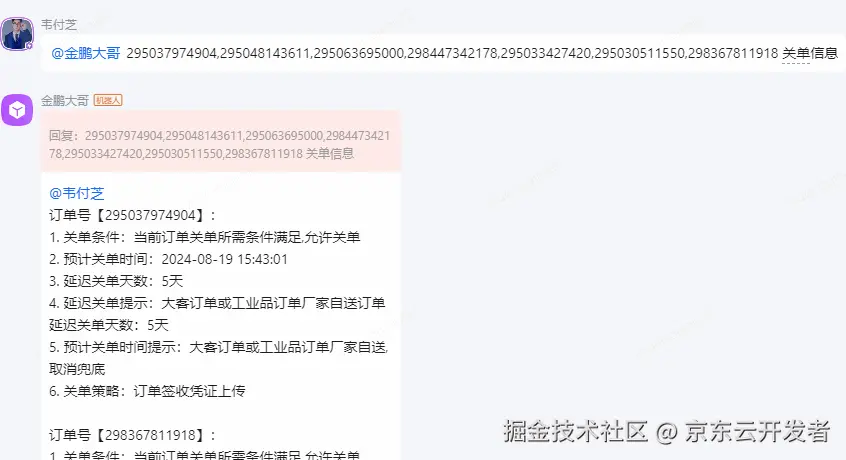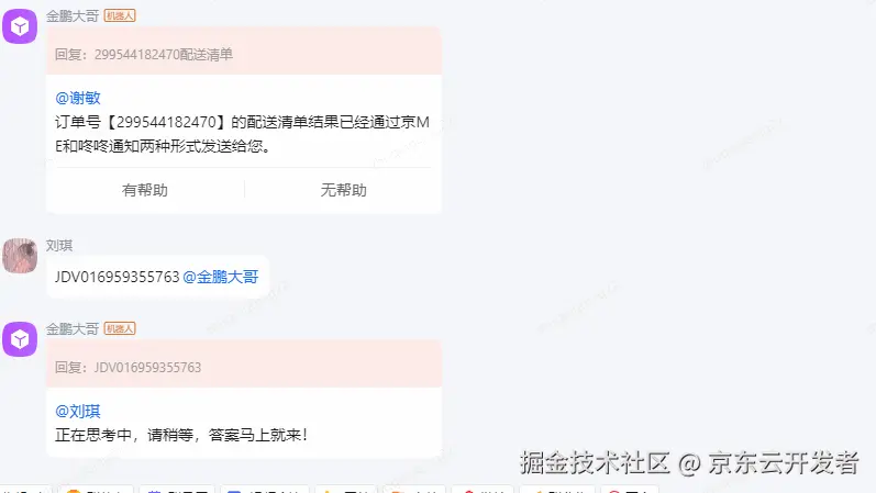 金鹏大哥Agent: 需求无需多方传递,问题解决时长从数小时、数天缩短至30秒内。 ********针对业务痛点,商家及履约技术部在AutoBots平台搭建了金鹏大哥Agent,打通了京ME与企业微信,实现了对多个核心业务系统的数据对接。智能体灵活调用系统部分权限,无论是内部员工还是外部合作伙伴,都可以直接与智能体对话,只需要提问并 @金鹏大哥,就可以快速获取需要了解的信息,简单易学上手快,极大地提升了整个订单履约流程中的运维效率。