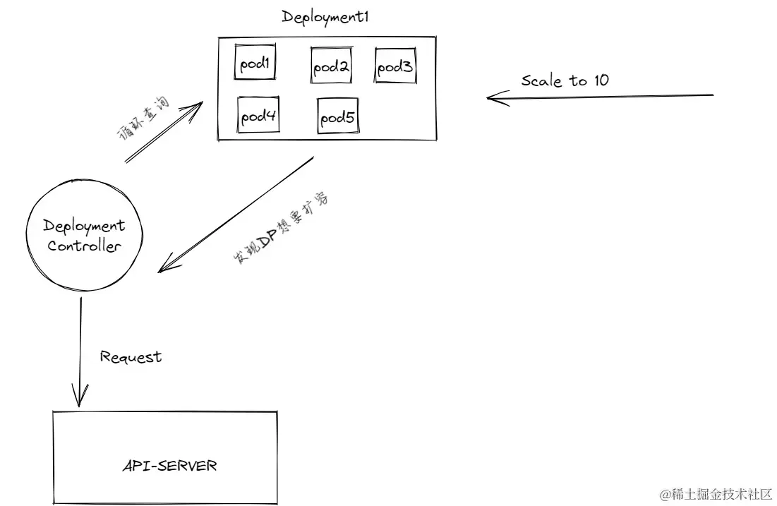 比如下图中,某个deployment当前的pod数量为5,我们使用kubectl scale deployment my-delpyment --replicas = 10去手动将这个deployment的pod数量扩容到10,这时其实是修改了deployment.spec.deseriedReplicas字段,它的值会变为10,那么这个预期状态会先被对应的deployment controller给发现,然后发送请求给api-server进行处理。