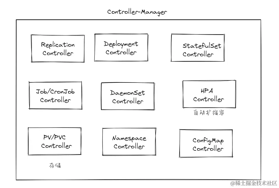 kube-controller-manager中蕴含了各种各样的控制器,如Deployment控制器、StatefulSet控制器、Replication控制器、JOB/CornJOB控制器、HPA控制器等等。下图有一个简单的概括,当然,除了这些控制器之外还有其他的控制器。