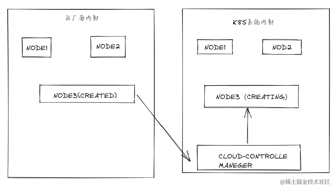 下面这张图能很清晰的看出cloud-controller-manager组件的作用,一个刚刚在云平台创建的NODE,被cloud-controller-manager识别,然后添加进集群内部。