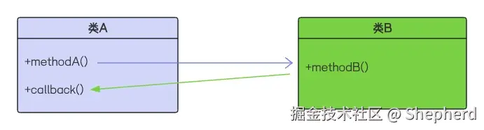 可以看出回调是一种双向调用关系,类A事先把回调函数callback()注册到类B上,接下来类A的methodA()在调用类B的methodB()的时候,类B的methodB()又反过来调用事先注册好的类A回调函数callback(),最终形成A调用B,B又调用A的双向调用场景,这就是回调机制