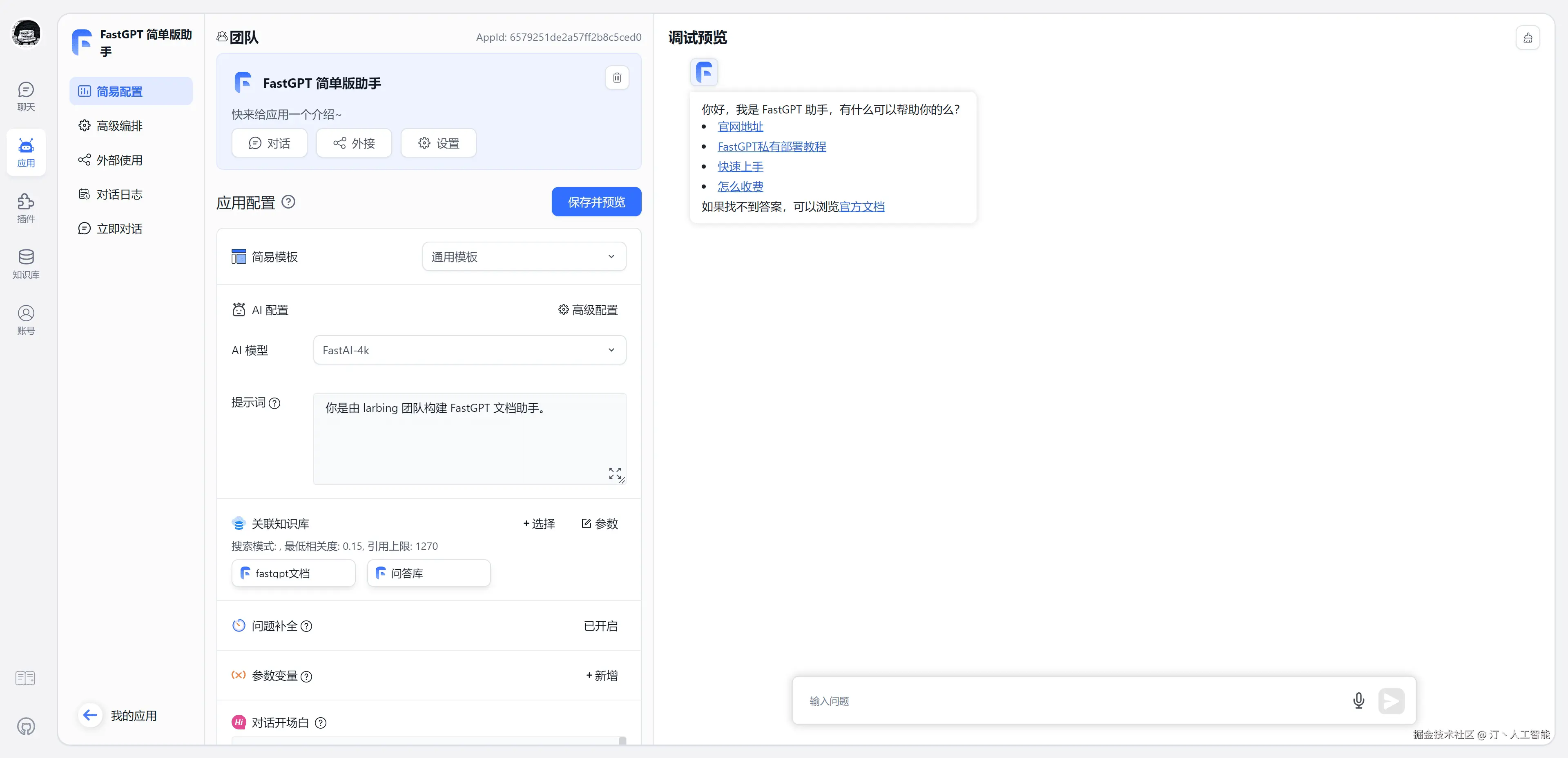 简单易用的可视化界面:FastGPT 采用直观的可视化界面设计,为各种应用场景提供了丰富实用的功能。通过简洁易懂的操作步骤,可以轻松完成 AI 客服的创建和训练流程。