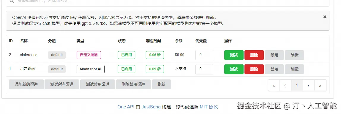 在 OneApi 中添加合适的 AI 模型渠道。点击查看相关教程