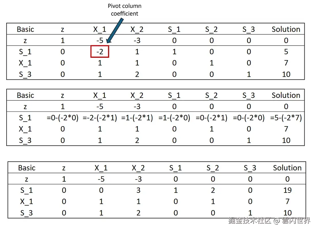 S₁ 行的数学运算现在“加起来了”。请记住,X₁ 现在等于 7。对应于第一行的约束是 -2X₁ + X₂ + S₁ = 5。经过第一步后,这等于 -14 + 0 + S₁ = 5。根据这个公式,S₁ 必须等于 19,这就是我们现在得到的“解决方案”列。我们将对其他两行执行相同的步骤。生成的表格是单纯形算法第一次迭代的输出。