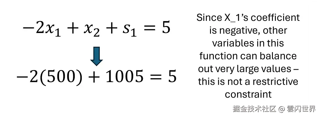 这是此选择背后的直觉。我们试图找到 X₁ 可以取的最大值,同时与它所属的线性方程组保持一致。对于第一个约束,实际上任何事情都可以发生,因为 X₁ 系数为负 - 其他变量可以在任何级别进行补偿,以使整体方程等于 5。显然,“任何事情都可以”并不是一个非常严格的约束😄!