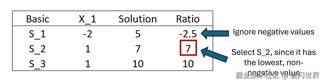 S_2 具有最低的非负比率,因此它将被选为离开变量。