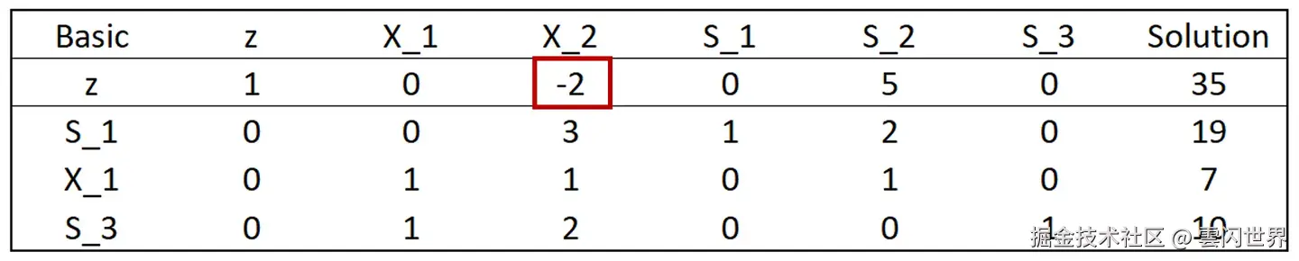 现在我们已经完成了第一次迭代,我们开始新的迭代并遵循与第一次迭代完全相同的步骤。请记住,第一步是找到 z 行上的最小负数。有趣的是……所有数字都是正数。当 z 行中的所有数字均为 0 或正数时,您当前处于最优点 - 这是单纯形法的停止标准。对于此示例,我们的最优解是 X₁ = 7 和 X₂ = 0,目标函数值为 35。松弛变量仅用于代数目的,在找到最优解后将被丢弃。 为了便于说明,我们假设 z 行中有一个负值。如下所示: