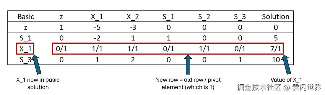 好的,让我们更新此表以进行我们需要进行的更改!第一步是更新 S₂ 的行(它得到特殊处理,因为它是我们要用 X₁ 交换的行),然后我们需要更新所有其他行。 我们通过将整行除以枢轴元素来更新枢轴行。这将设置行,以便“解决方案”列的值等于 X₁ 值。不幸的是,对于这个例子,由于枢轴元素是 1,所以看起来什么都没有改变(我想我应该选一个更好的例子……)。但我们将更新“基本”列以显示 X₁ 现在在基本解决方案中,而 S₂ 不在。