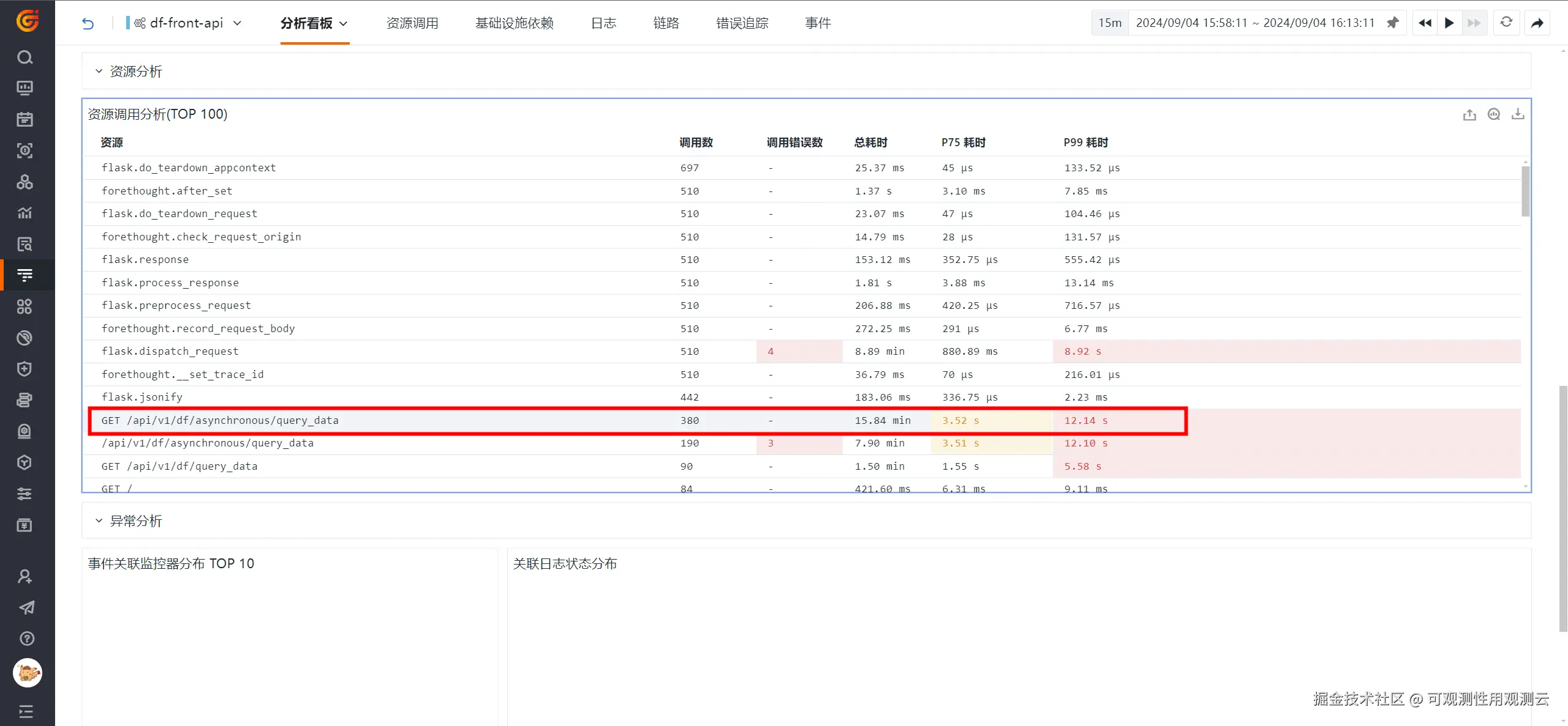 2、点击服务进入分析看板,通过【资源调用分析】列表可以看出,当前服务发起的资源调用里面 query_data 这个资源的耗时是比较长的,这个是观测云的一个数据查询接口,接下来我们看下这个接口在查询过程当中,到底是因为什么导致耗时较长。