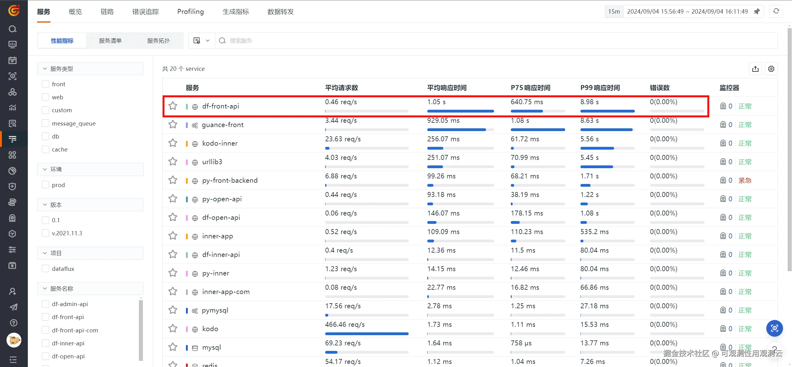 1、登录观测云工作空间,查看服务性能指标列表,从页面已经可以看出 df-front-api 服务的 P90 响应时间是比较长的。